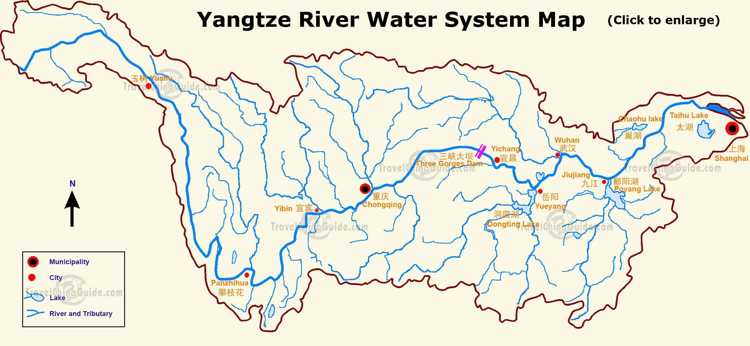 As the largest water system in China, Yangtze River is historically, economically and culturally important to the country. It has numerous tributaries including Min River, Han River, Jialing River, Gan River, and Huangpu River. The Three Gorges Dam on the river is the largest dam project and hydropower station in the world. Generally, people consider the river a dividing line between North China and South China. Areas to the north and the south of the river have many differences in climate, scenery, economics, culture and folk customs.