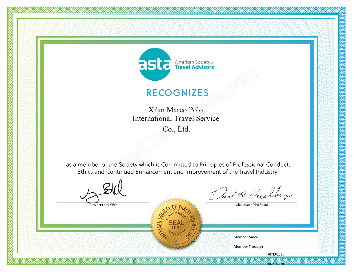 Secondly, check to see if the company is accepted by the authoritative tourism organizations. Our website (Xi'an Marco Polo Int'l Travel Service Co., Ltd.) has become a member of ASTA (American Society of Travel Agents), the world's largest association of travel professionals. Our member ID is 900207220. We have also been recognized and accepted as a member by Pacific Asia Travel Association (PATA), which is the leading voice and authority on Asia Pacific tourism. We kindly remind you that some companies claim that they are members of PATA by putting the PATA logo on their web pages;however about 80% of these so-called members are not real.A real member always has a membership number which is issued by PATA every year. One may tell if the company is a real PATA member in two ways, as follows: