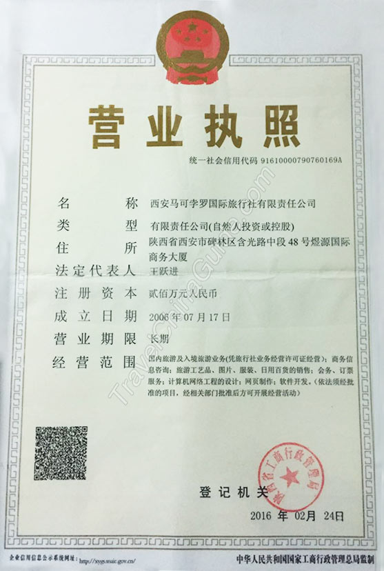 Please note that those companies named 'Network' or 'Business' have no legal right to operate tours although they may have a license to engage in other business activities. Our website (Xi'an Marco Polo Int'l Travel Service Co., Ltd.) has proven qualifications and is licensed to organize tours in China for overseas visitors.