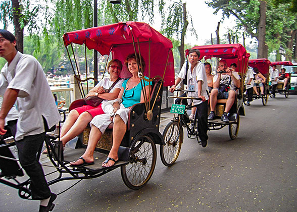 Visit Mutianyu Great Wall by a round-trip cable car ride and toast for Great Wall challenge with red wine; enjoy a buffet lunch, and then drive by Olympic Bird's Nest; take a rickshaw ride through Hutong alleys and visit a local family in a traditional courtyard house. (B+L)