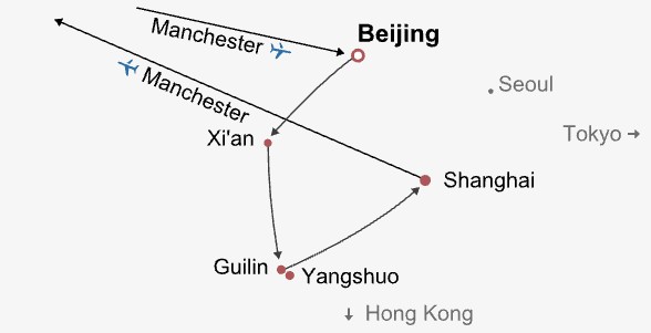 Most China tours from UK with airfare included depart from London, because there are direct flights reaching over 10 cities in China, including the most favored travel destinations like Beijing, Shanghai, Guangzhou, and Xi’an. Besides, travelers can fly from Manchester or Edinburgh to Beijing. A one-way trip takes around 10 hours.